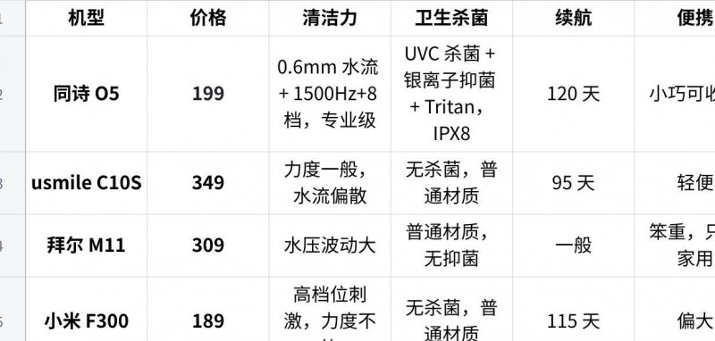 三、5 款热门冲牙器深度对比:同诗 O5 全面领先