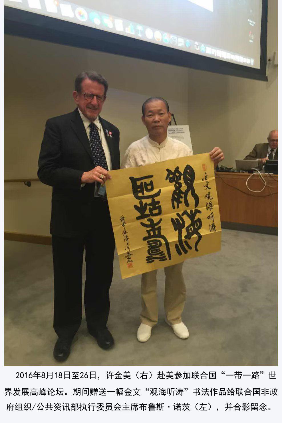 △著名学者丶中国文联副主席丶中国书法家协会顾问沈鹏看了许金美先生在报刊杂志发表的各种各样书法作品后,曾多次评价说:“许金美不仅画的好看”,而且是“当代中国书法界的一匹黑馬”丶“古有王曦之,今有许金美”。
