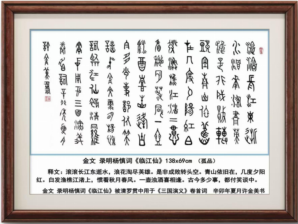 △香港著名学者,甲骨文书法家饶宗颐在国内外一些报刊上看到了许金美发表的甲骨文书法作品后评价说:“当今奇才,中国甲骨文书法第一人"。