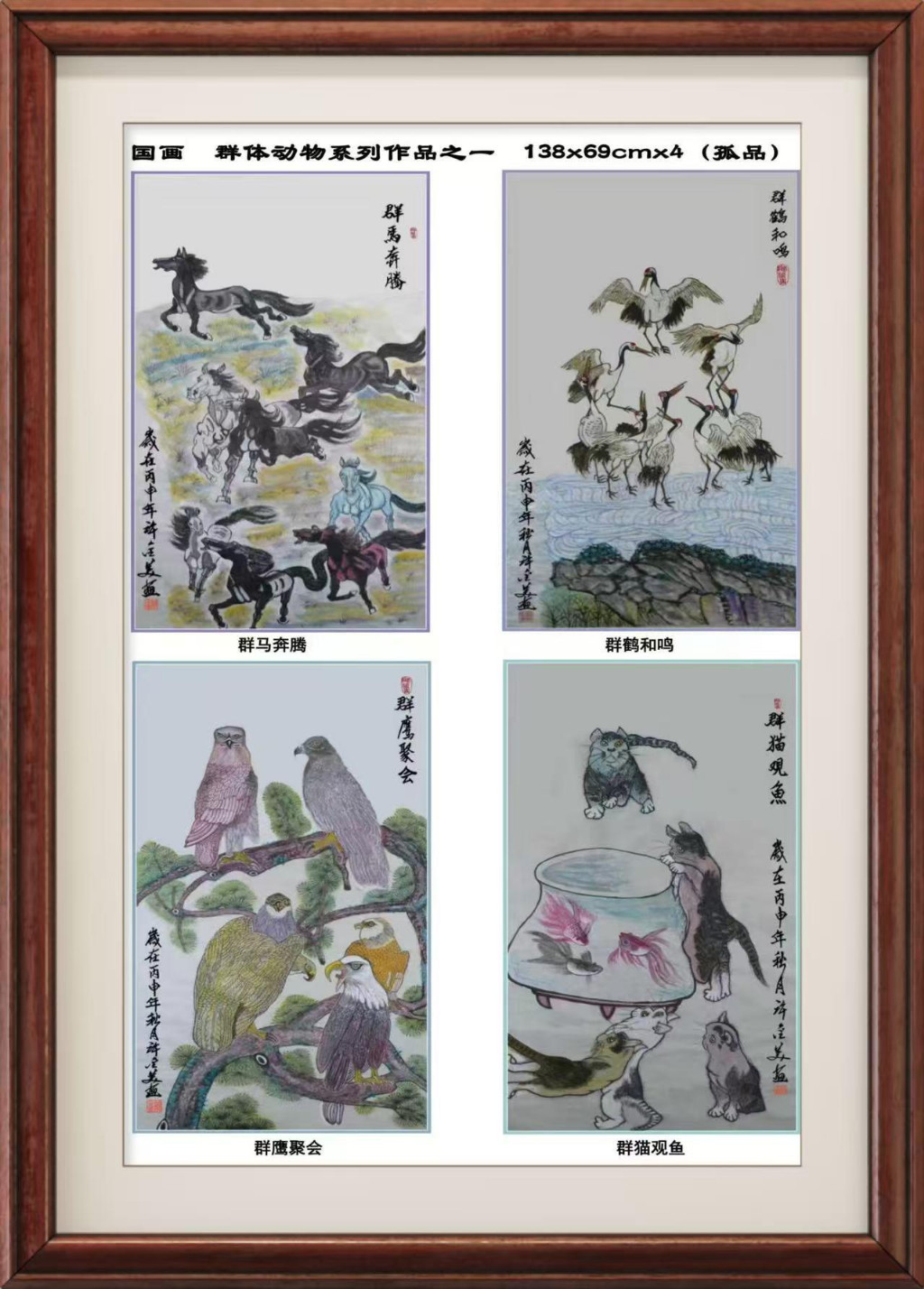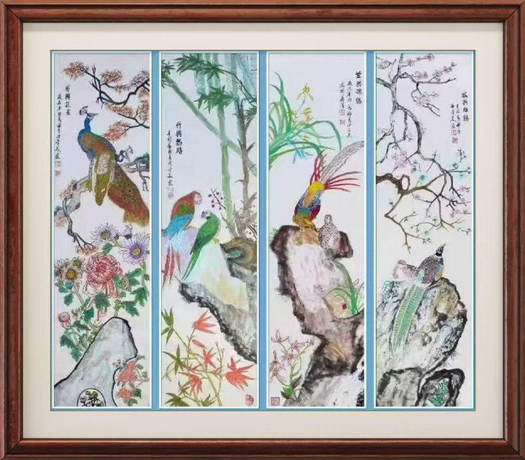 工笔画:梅兰竹菊四条屏276x194Cm(孤品),并入选《中美建交75周年》邮册之中。