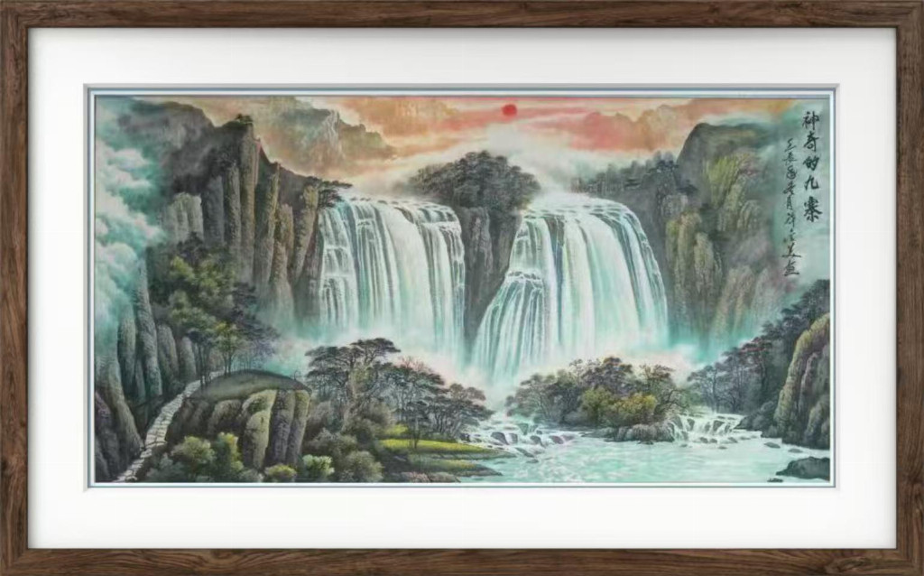 国画:神奇的九寨180cmx97cm(孤品)。刊登在本人出版的巜中美建交37周年》的纪念邮册中。