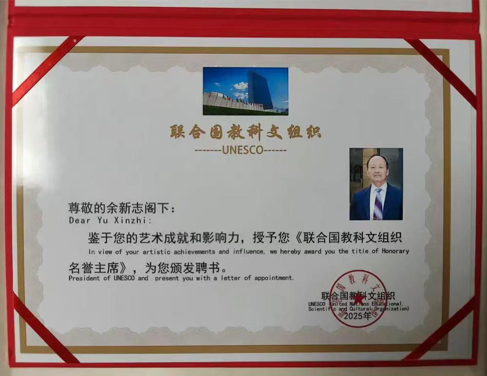 2025年联合国教科文组织聘请余新志先生为联合国教科文组织名誉主席,并为余老师颁发聘任证书.