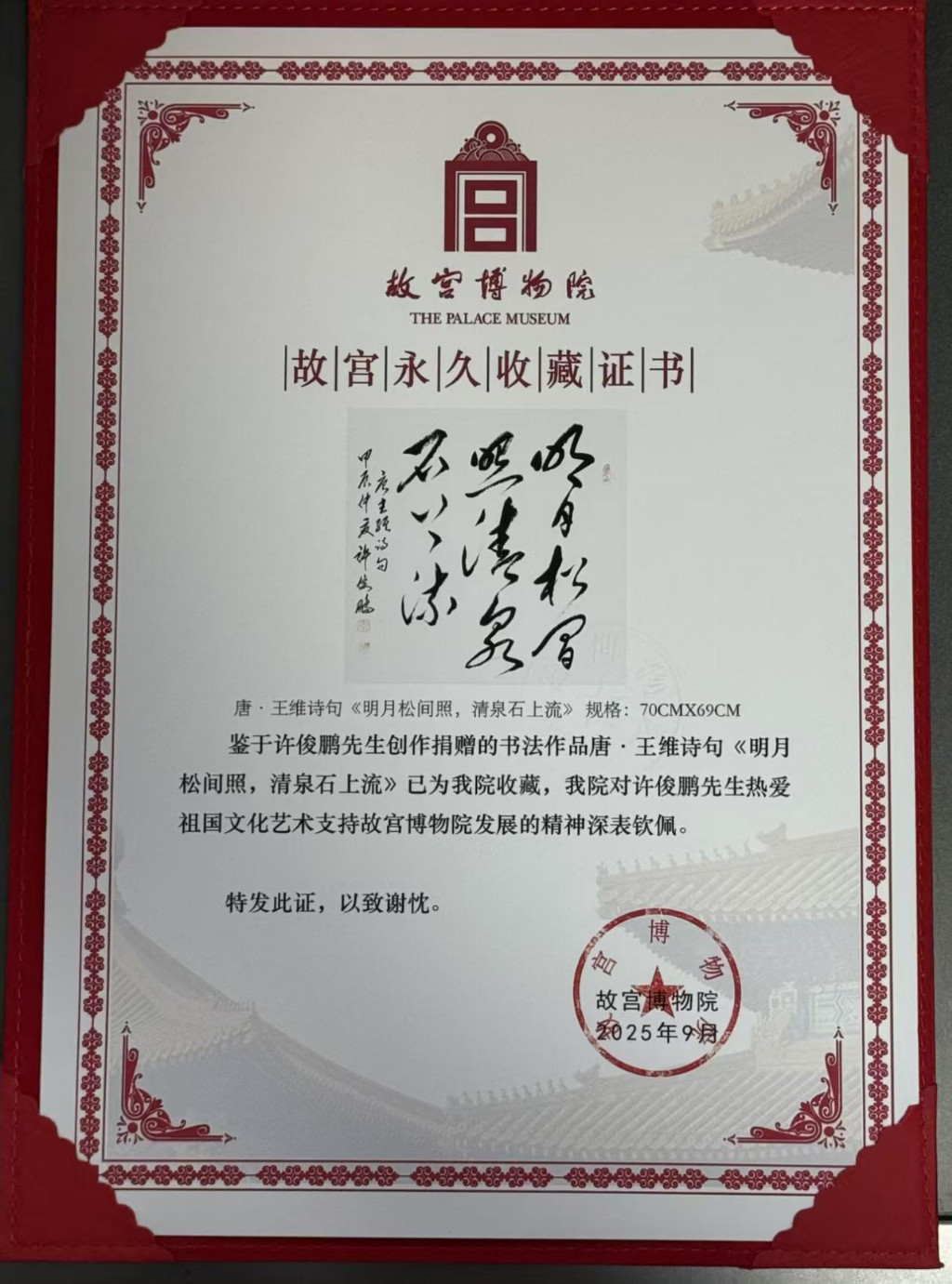 2016年12月,经中华人民共和国文化部批准,文化部文化艺术人才中心主办,成功在北京中国国家画院国展美术中心举办“书写人生 绘出风采”一一许俊鹏书法展。
